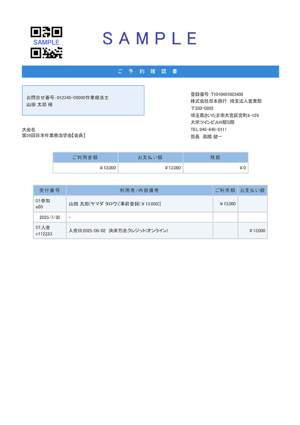 第59回日本作業療法学会予約確認書(例)